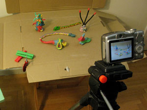 Τοποθετώστο σκηνικό μου τις μορφές από πλαστελίνη και ό,τι άλλο θέλω να φαίνεται από την αρχή της ταινίας μου. Αυτά που δεν είναι από πλαστελίνη και θέλω να μείνουν ακίνητα μπορώ να τα σταθεροποιήσω με χαρτοταινία (προσέχω να μη φαίνεται).